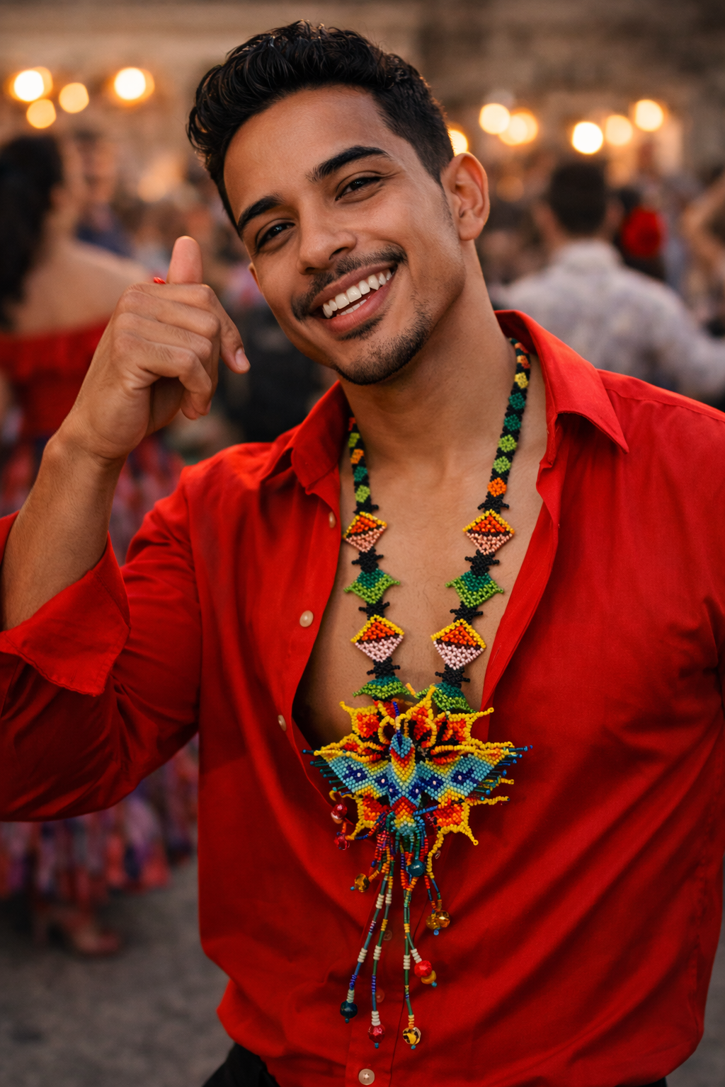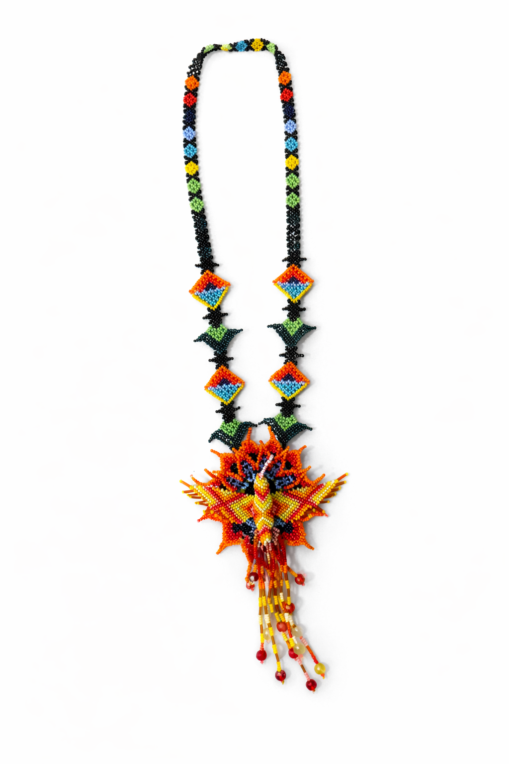 Each bead is carefully placed to create depth, symmetry, and vibrant contrast—symbolizing nature, heritage, and celebration. The long beaded strand showcases repeating traditional patterns in red, black, white, and earth tones, making this piece both eye-catching and deeply meaningful.